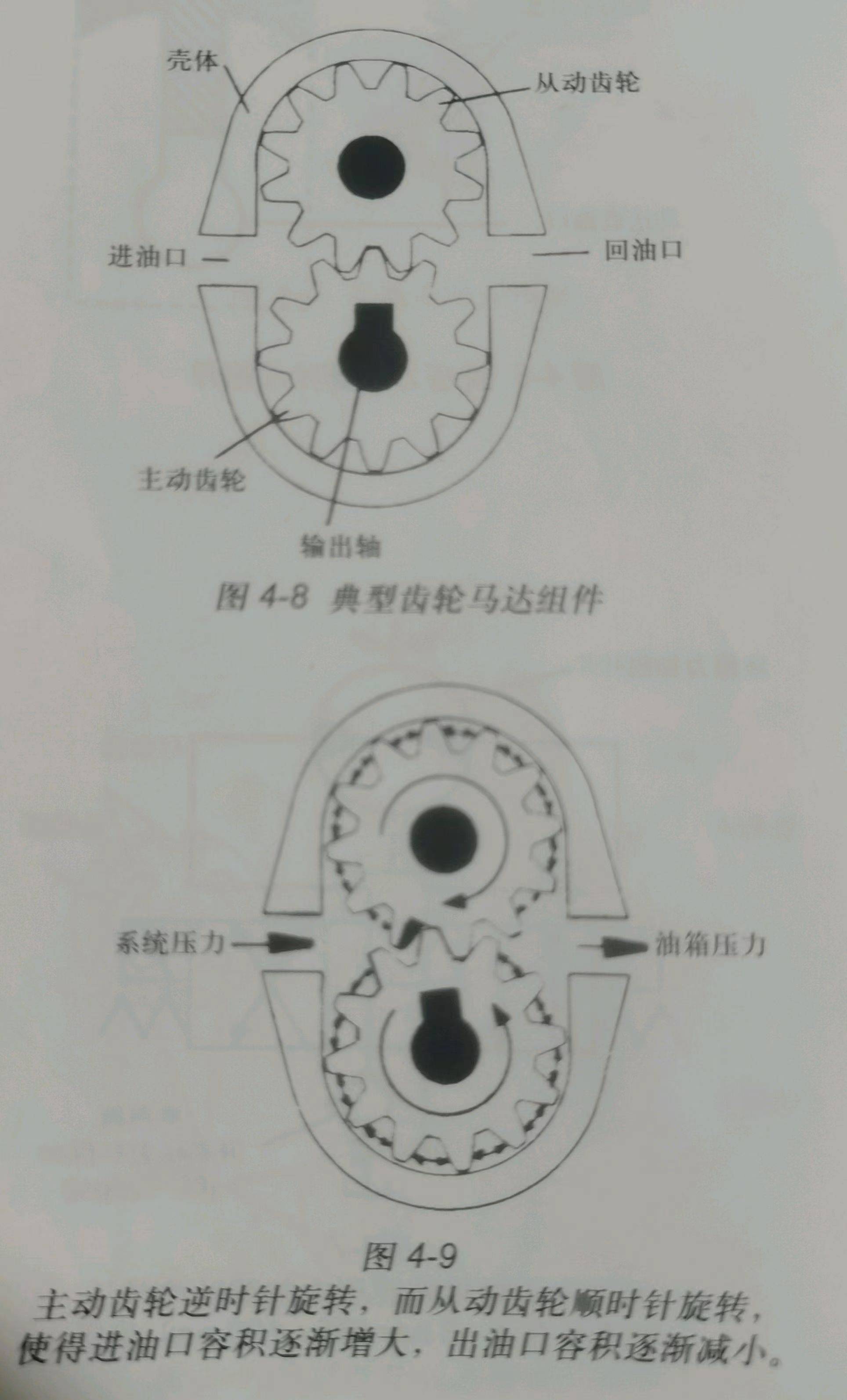 如圖4-8所示,一般由帶進油口和 回油口的殼體,以及兩個齒輪構(gòu)成的旋轉(zhuǎn)組件 組成。其中,一個齒輪是主動齒輪,與驅(qū)動負 載的輸出軸相聯(lián);另一個齒輪是從動齒輪。